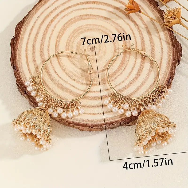1 Pair Boho Jhumka Hoop Earrings, Imitation Pearl Zinc Alloy Earrings with Tassel, Simple Solid Color, Daily Party Occasion Jewelry Gift.